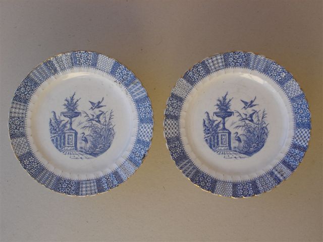 LUNEVILLE - KELLER et GUERIN. Paire d'ASSIETTES en faïence à décor imprimé en bleu, dans le bassin, d'échassiers dans les marais s'approchant d'un vase fleuri. Aile polylobée à motifs pleins alternés de grecques. Marquées K et G Lunéville.