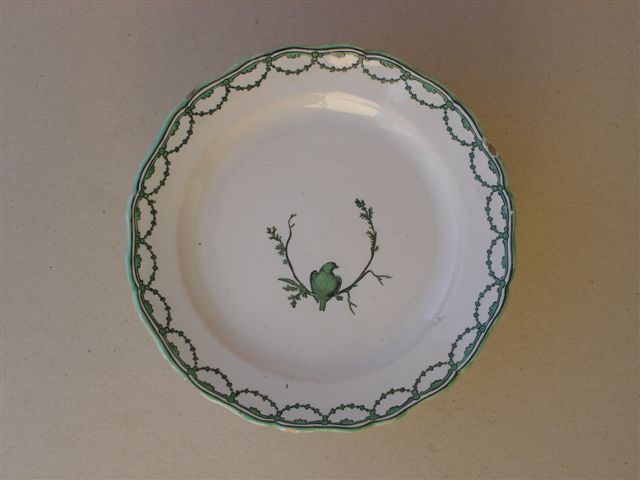 MARSEILLE - Gaspard ROBERT. ASSIETTE en faïence de petit feu. Décor à tracé noir peint en vert d'un oiseau branché. Aile chantournée agrémentée de guirlandes. Marquée.