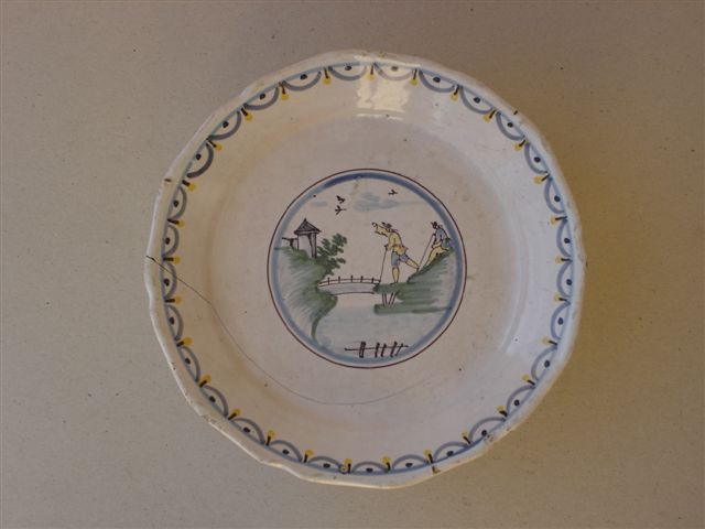 NEVERS - ASSIETTE en faïence de grand feu. Décor polychrome circulaire dans le bassin d'un paysage au pont que deux personnages s'apprêtent à traverser. Aile chantournée peinte de guirlandes stylisées.
