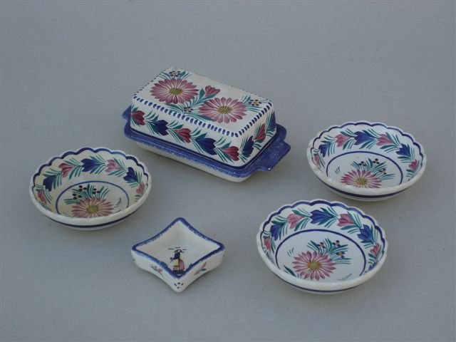 QUIMPER - Suite de 3 RAMEQUINS polylobés, BEURRIER couvert rectangulaire et CENDRIER quadrangulaire en faïence. Décor polychrome floral et d'une bretonne pour le cendrier. Marqués HB Quimper et HB Quimper France.