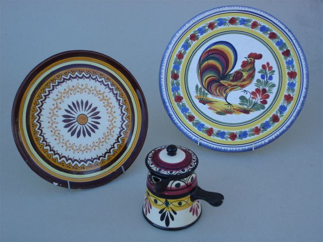 QUIMPER - Deux PLATS ronds à gâteaux en faïence polychrome. L'un à décor d'un coq entouré d'une guirlande de fleurs stylisées, bordure bleue à l'éponge. L'autre à rayures et motifs géométriques bruns, jaune et orange. Marqués Henriot Quimper et Henriot Quimper France.
