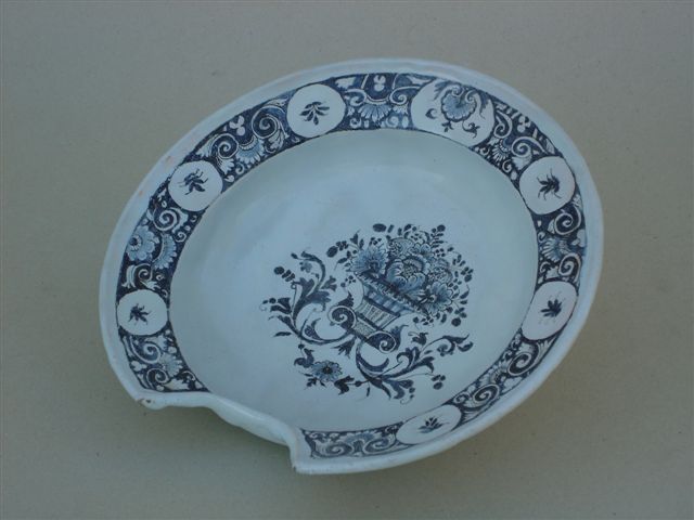 ROUEN - PLAT à BARBE en faïence de grand feu. Décor en bleu d'un vase fleuri dans le bassin et de "broderie" sur l'aile.