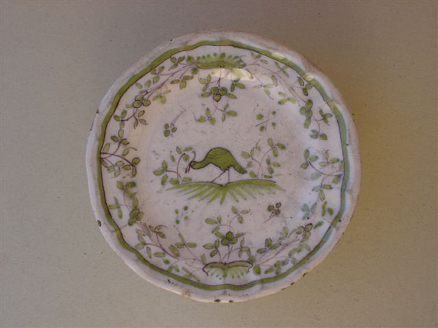 Décor peint vert et manganèse d'un oiseau entouré de guirlandes de feuillage sur émail blanc.