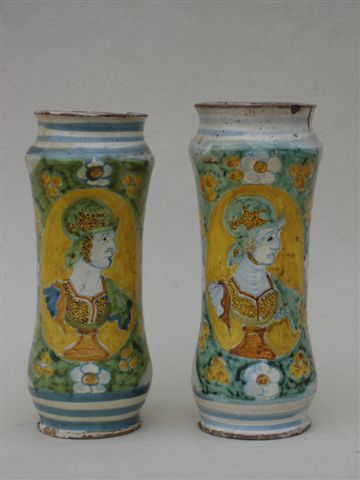 PAIRE de VASES à pharmacie en faïence de grand feu polychrome, ornés de personnages en armure, sur piédouche.