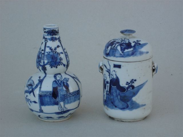 POT cylindrique à décor peint en bleu sur le corps et le couvercle d'un personnage se faisant servir le thé. Anses latérales (Haut. 13,5 cm, égrenures à la prise du couvercle et au talon).