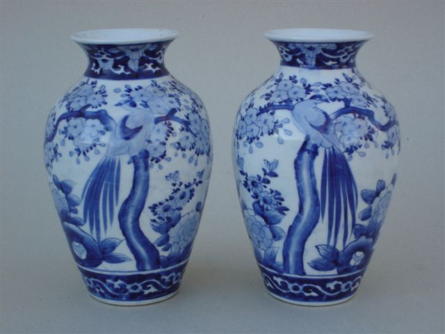 Paire de VASES balustres en porcelaine de Chine à décor peint en bleu de fleurs et d'un oiseau perché dans un arbre fleuri.