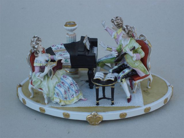 "La musique". GROUPE en porcelaine polychrome rehaussée d'or représentant un pianiste, un joueur de mandoline et une chanteuse à sa partition, sur socle ovale dans le goût du XVIIIème.