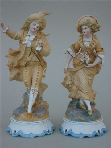 COUPLE en porcelaine biscuit. Deux statuettes polychromes sur base circulaire de style Louis XV. Rehauts d'or. Marque en creux VG 1.