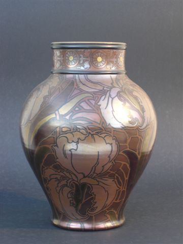 VASE de forme balustre en terre cuite à décor métallisé de fleurs dans des ramages. Col bagué à motifs de fleurs stylisées rayonnantes. Marqué en noir BFK 17, et en creux 165.