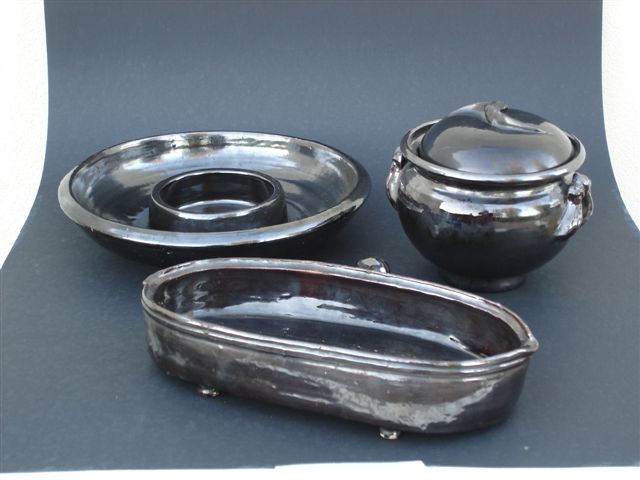 ENSEMBLE en faïence à engobe brun comprenant une soupière, prise du couvercle aux deux poissons (Haut. 21 cm) un lèchefrite (Long.41 cm, fêle), et un plat rond (Diam. 39 cm).