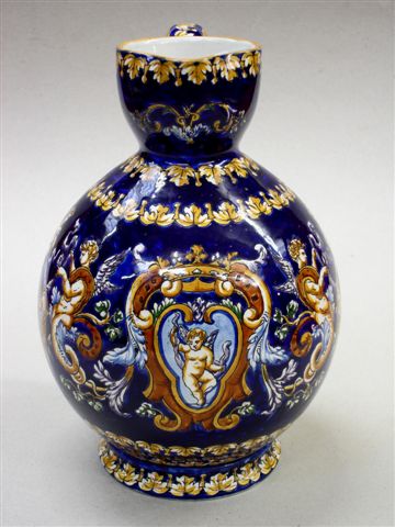 GIEN - PICHET ventru en faïence à décor polychrome dit Renaissance italienne sur fond bleu, représentant Cupidon dans un cartouche entouré d'arabesques, de personnages à corps d'animaux, d'amours et dragons.