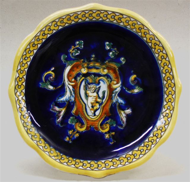 GIEN - ASSIETTE en faïence à bord contourné, à décor dit Renaissance italienne sur fond bleu. Elle est ornée en son centre d'un amour dans un cartouche feuillagé, au bord de l'assiette, frise de fleurs trilobées jaunes.
