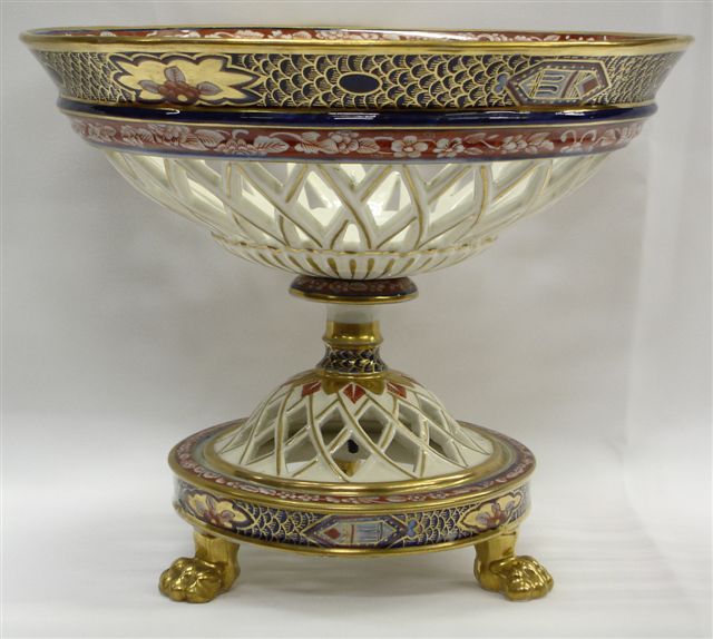 BAYEUX. Coupe ronde sur piédouche reposant sur 3 patins ; base et réceptacle ajourés en quadrillage. Porcelaine polychrome et or, à décor corail de plumes et feuillages.