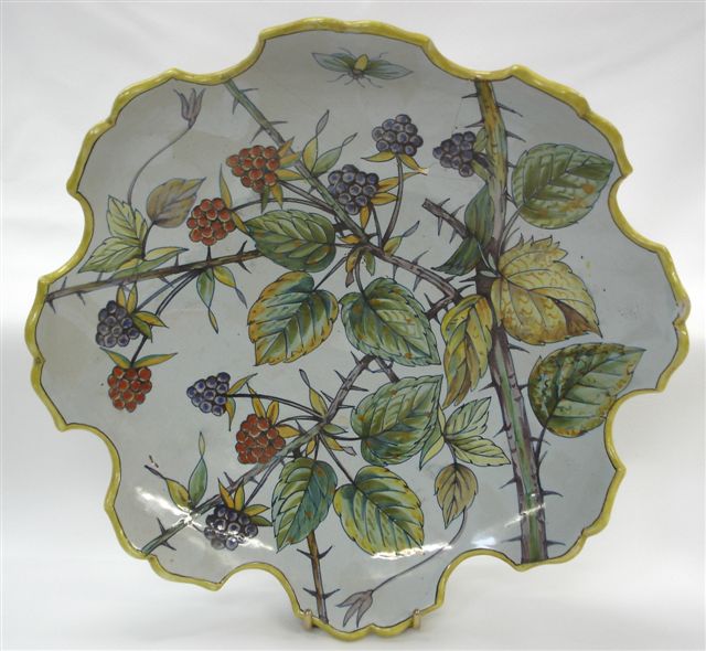 PORQUIER BEAU - COUPE polylobée à décor botanique, bord jaune. Motif de ronces et mûres. Marquée PB en bleu.