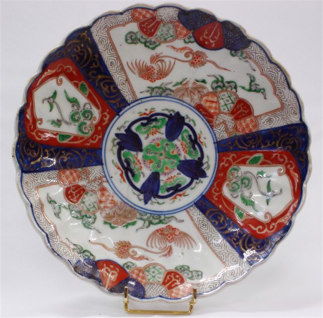 IMARI (?) - ASSIETTE décorée, filets bleus et motifs au revers.