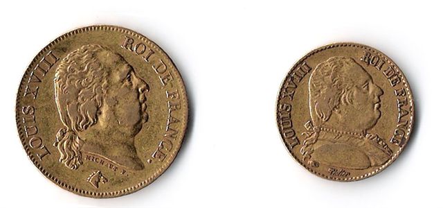 Lot: LOUIS XVIII (1814-1824), 1 pièce de 40F, 1 pièce de 20F, 1814, A. TTB