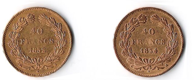 2 pièces 40F, 1832, B (rare), 1834 A TTB