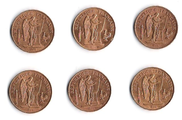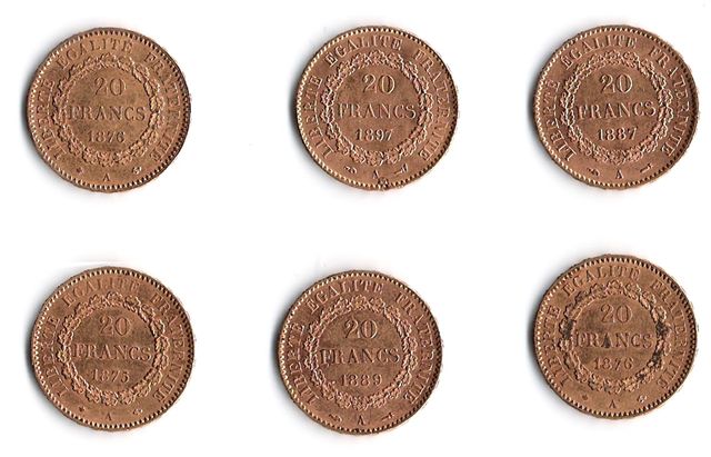 Lot ; 3ème RÉPUBLIQUE, 6 pièces de 20F, (type Génie), 1875, 1876(x2), 1887, 1889, 1897, A. TTB