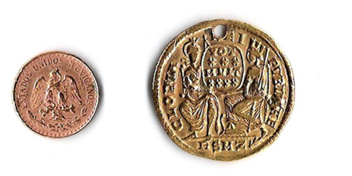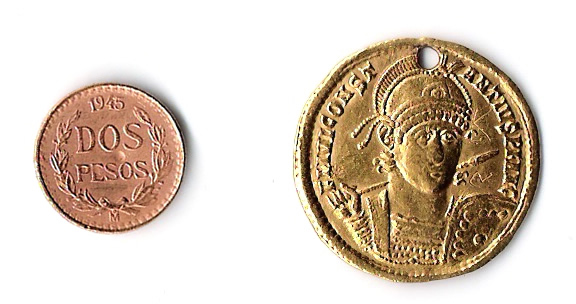 Lot: Empire Romain, CONSTANCE II (324-361 ap. J.C.), solidus, (4,4g), percé à 12h, traces de monture. On y joint 1 pièce de 2 pesos (Mexique), un coup au centre du revers.