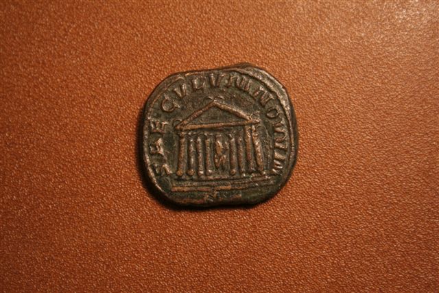 Temple à huit colonnes, au centre Jupiter ou Rome assis de face. Fronton orné à ses extrémités.