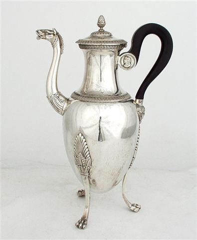 CAFETIÈRE argente, tripode à griffes ceinturée par une moulure de feuilles d'eau ; la prise de couvercle en bouton ovale tourbillon sur rosace ; le bec verseur à "tête de cheval". Anse en bois noir.