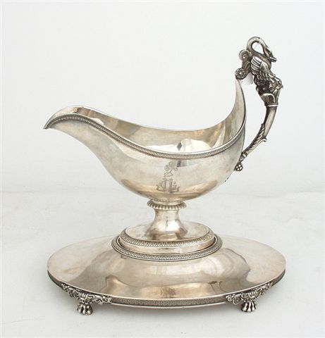 SAUCIÈRE casque argent sur grand plateau ovale à doucine, reposant sur des pieds à griffes, à moulures de marguerites. La saucière est réhausée de feuilles d'eau et de godrons doubles. L'anse représente un cygne sur une corne d'abondance. Poinçon Michel-Ange, 1819-1838. Poids: 1.020 g.