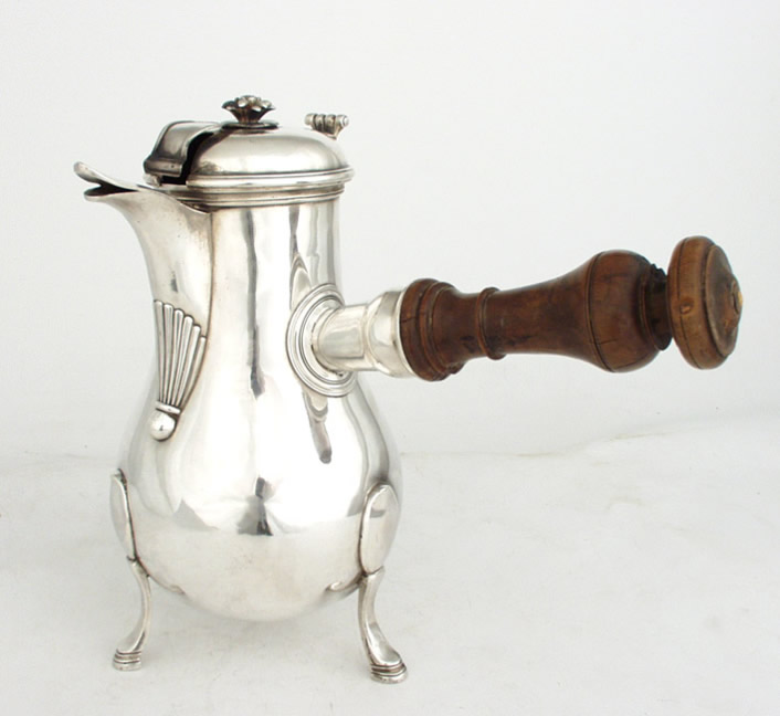 VERSEUSE tripode argent sur pieds patins à attaches écusson, le bec verseur "canard", le couvercle à charnière et appui pouce mouluré. La graine mobile est en forme de fleur. Perpignan, vers 1785.