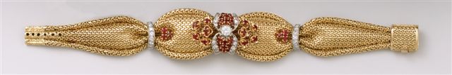 BRACELET souple en or jaune tressé à l'imitation d'un tissu, orné de motifs sertis de diamants et rubis. Travail parisien de l'entre deux guerres.