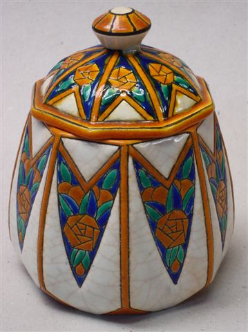POT octogonal couvert. Décor de fleurs géométriques oranges sur fond bleu et blanc alternées de bandes oranges.