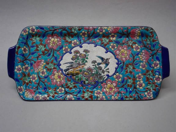 PLAT à CAKE rectangulaire à anses. Il est orné en son centre d'une scène d'oiseaux s'envollant d'un bosquet fleuri, ce cartel sur fond blanc est entouré d'une composition de fleurs polychromes sur fond bleu, l'estérieur du plat en bleu turquoise.