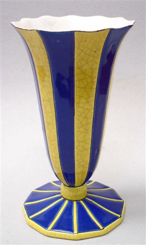 VASE tulipe à bord contourné. Décor alterné de bleu et de jaune craquelé.