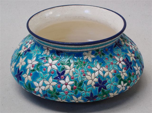 CACHE-POT de forme pansue. Décor plein d'un semis de fleurettes sur fond bleu.