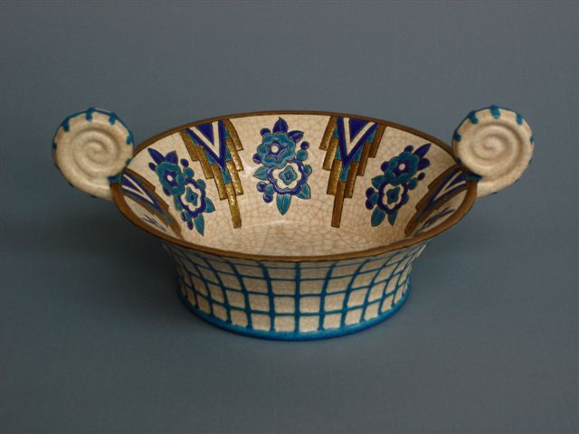 LONGWY - COUPE à deux oreilles. Décor de fleurs bleues sur fond craquelé crème, alterné de figures géométriques.