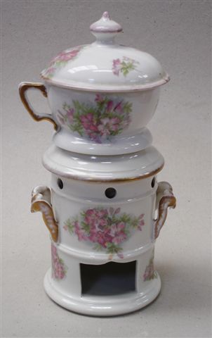 LIMOGES - TISANIÈRE en porcelaine, cinq parties, à décor de compositions fleuries rose sur fond blanc. Les prises de forme contournées sont dorées.