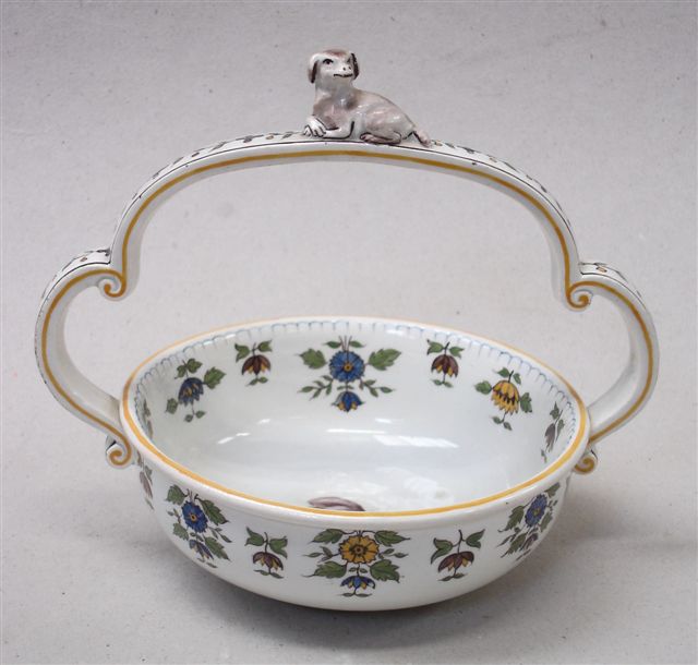 CORBEILLE en faïence décorée d'un personnage rieur en grisaille. Chutes de fleurs en bordure et sur l'anse contournée. Cette dernière est surmontée d'un chien couché.