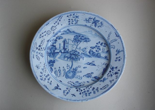 NEVERS - PLAT circulaire en faïence de grand feu. Décor en camaïeu bleu d'un paysage animé de personnages dont l'un s'approche d'un fontaine. Aile peinte de branches fleuries, d'oiseaux et d'insectes.