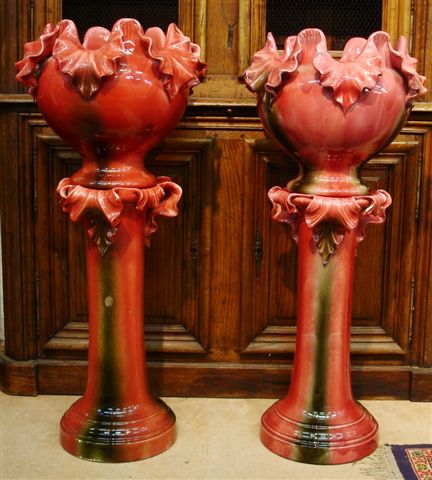 VALLAURIS. Paire de vasques en barbotine sur piédouche, à couverte rouge et coulis brun. Bord à décor de feuilles renversées. Chacune repose sur une sellette assortie avec bord de feuilles recourbées. (petites égrenures)