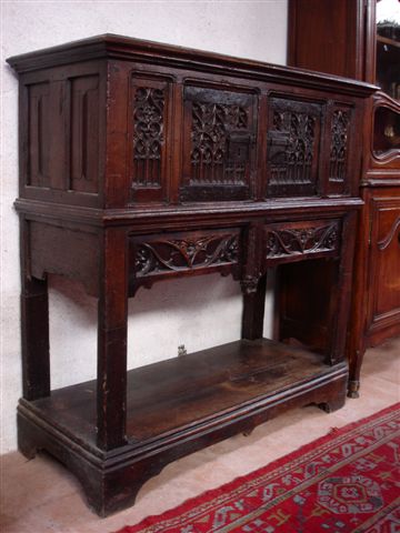 DRESSOIR en chêne mouluré et sculpté et fer forgé. Le corps supérieur ouvrant à deux battants séparés par un faux dormant, est décoré de quatre panneaux sculptés de fenestrage, ogives, lancettes, mouchettes et accolades. Les montants latéraux à motifs de parchemin. Dans la partie inférieure, ceinture ornée de feuillages et rosaces. Cul de lampe en tête d'angelot. Montants à section carrée reposant sur une un sous-bassement en plinthe.