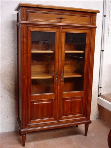 BIBLIOTHÈQUE en bois de placage à deux vantaux vitrés. Elle ouvre à un tiroir supérieur. Les montants en forme de pilastre cannelé, pieds fuselés.