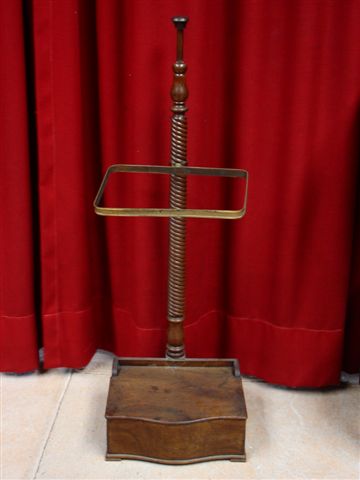 MEUBLE CRACHOIR en noyer tourné. Caisse rectangulaire à façade galbée contenant une cuvette en métal. Cette boîte s'ouvre grâce à une tige coulissante à l'intérieur d'un montant torsadé, en balustre à la base et piriforme en haut. Au montant est joint un élément rectangulaire en métal doré à décor amati, fixé par une bague. XIXème?