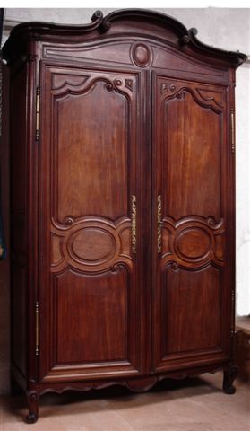 ARMOIRE en acajou et placage d'acajou mouluré et sculpté. La corniche cintrée en chapeau de gendarme, ornée de motifs d'enroulements. Elle ouvre à deux vantaux à décor de doubles moulures interrompues par un motif circulaire. Montants droits arrondis terminés par deux pieds galbés. La traverse inférieure contournée.