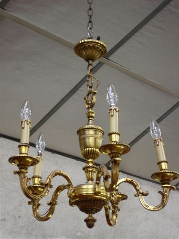 LUSTRE en bronze à cinq bras de lumière à volutes feuillagées sortant du fut en cassolettes superposées. Décor de godrons. Style Louis XIV.