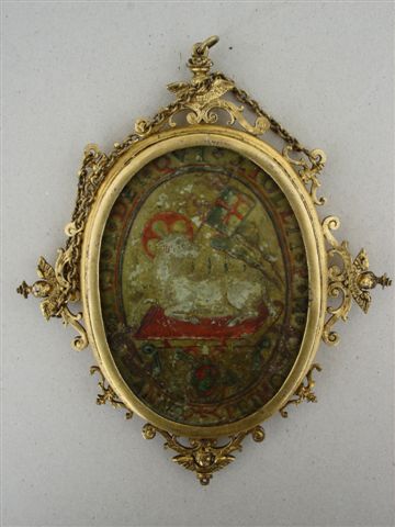 MEDAILLON ovale en cire polychrome, représentant une Déposition de Croix entourée de la légende: "MAX ASSIMILABOR DESCEN IN LACUM GRE XIII PON . Sur l'autre face, l'Agneau surmonté d'une croix, symbole de l'ordre des Bénédictins, légendé: "ANNO PRIMO, ECCE A DEI QUI TOLLIT P M".