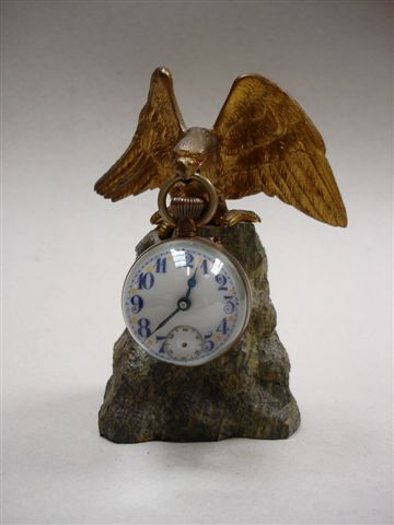 PENDULE en bronze ciselé et doré représentant un aigle aux ailes déployées tenant dans son bec le cadran émaillé en bleu et or dans une boule en verre. L'aigle repose sur une base en marbre imitant une roche.