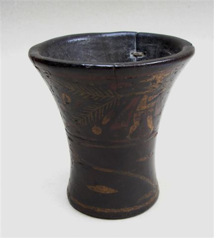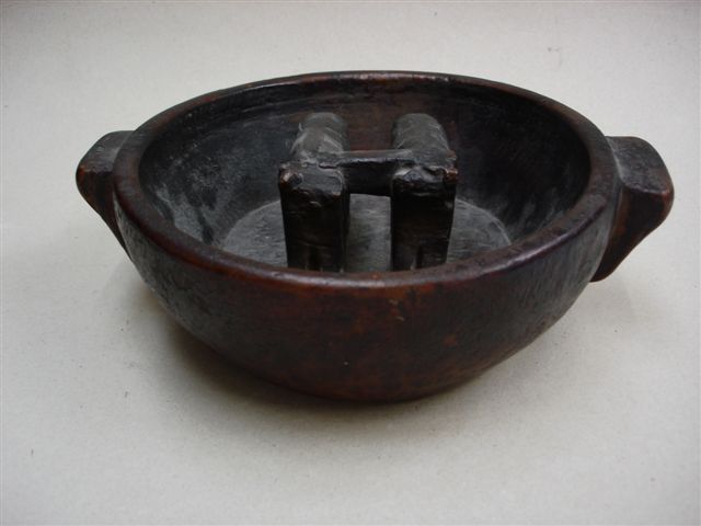 Lot de 2 OBJETS d'art primitif: AFRIQUE. BOL à anses en bois sculpté patiné au couple de boeufs stylisés. AMÉRIQUE du SUD, VASE à profil concave en bois sculpté à incrustations polychromes géométriques et de personnages dans des encadremements. Marqué d'une croix au revers (rest. ancienne).