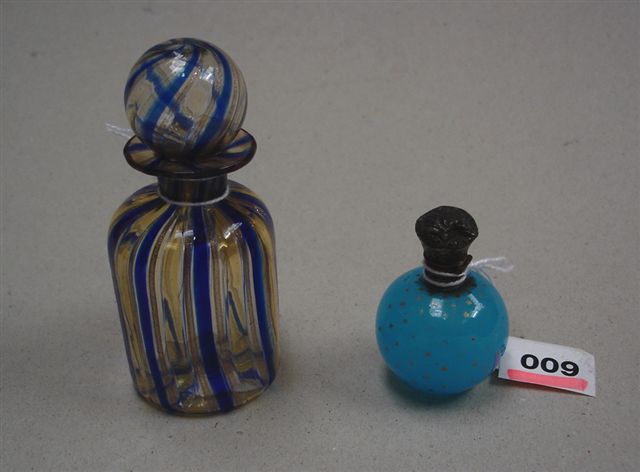 Joint: FLACON en verre à inclusions de poudre dorée. Haut. 9 et 10,5 cm.