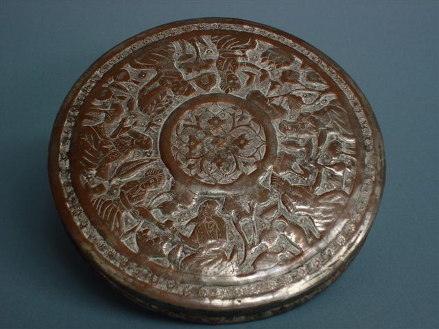 Décor tournant et rayonnant en repoussé sur les deux faces d'oiseaux, de fleurs et de personnages.