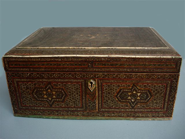 COFFRET rectangulaire à incrustations polychromes toutes faces d'étoiles, losanges et motifs géométriques dans des encadrements.