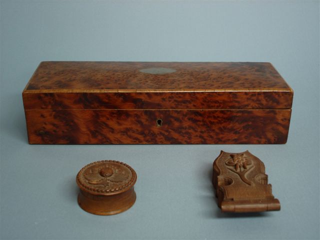 BOÎTE à gants en placage de loupe de noyer. Couvercle légèrement bombé incrusté d'un cartouche métallique au centre. Haut. 7,5, Long. 32, Larg. 11 cm. (mque serrure)