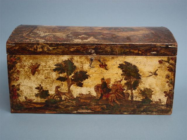 COFFRE en arte povera à couvercle bombé à décor appliqué de gravures détourées mises en couleur, représentant une scène galante et de chasse à courre.